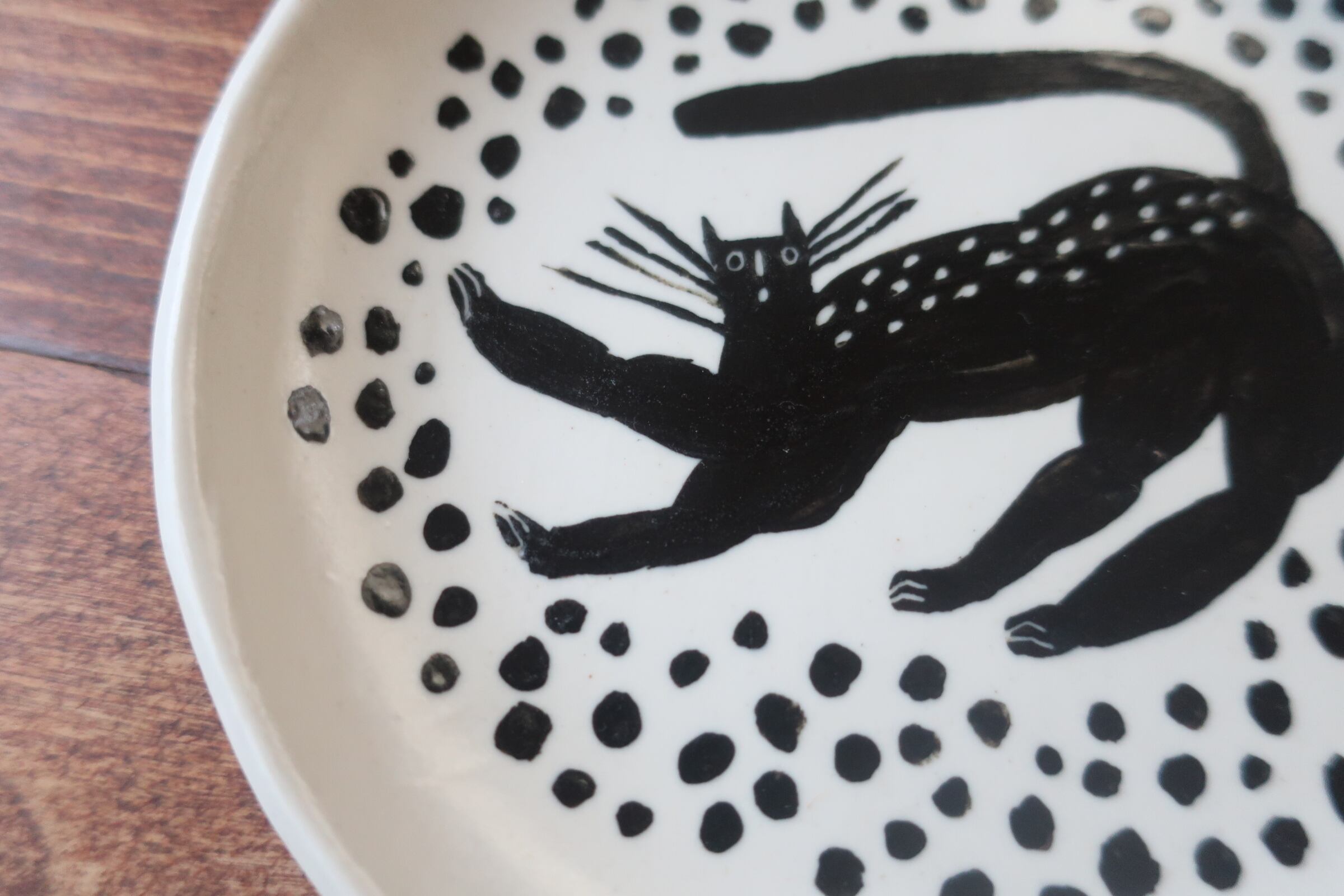 ・制作過程での釉薬のムラや、焼け、白い部分に化粧土の黒い色が飛んだ部分がある場合がありますが、手づくり特有のものとしてご理解いただきますようよろしくお願いいたします。